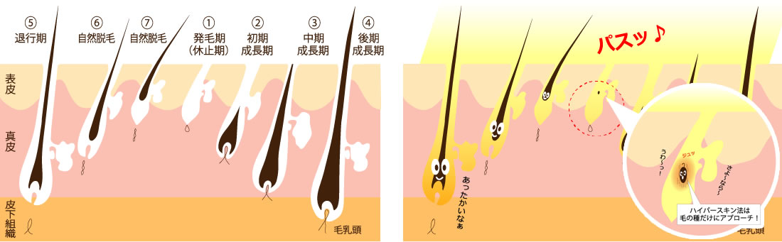 毛髪が成長して抜けるまで「発毛期」「初期成長期」「中期成長期」「後期成長期」「退行期」「自然脱毛」の期間があります。ハイパースキン脱毛は「発毛期」にのみ作用する事から熱くなく、痛くない脱毛が可能なんです。
